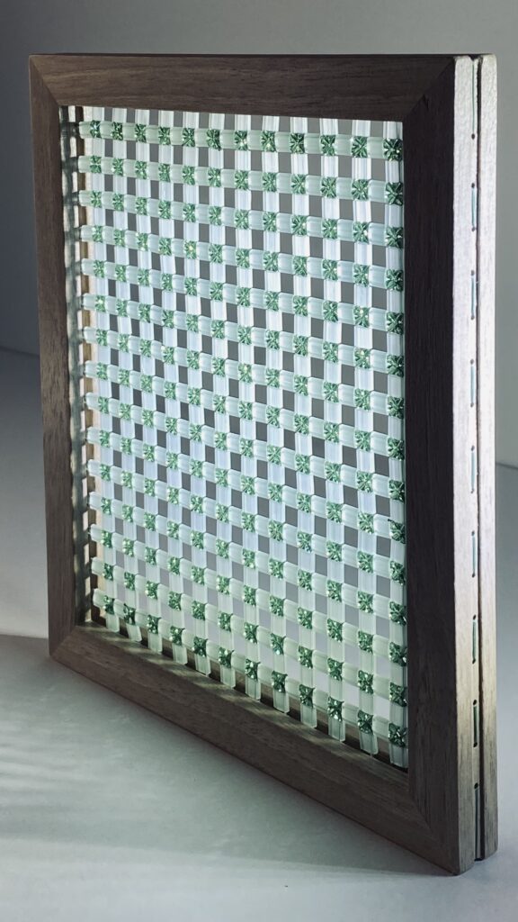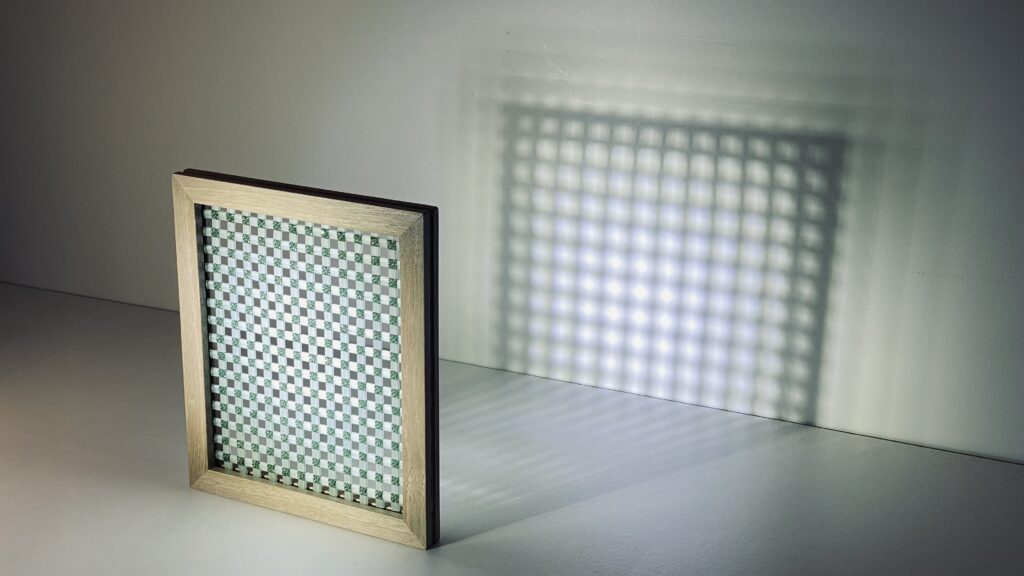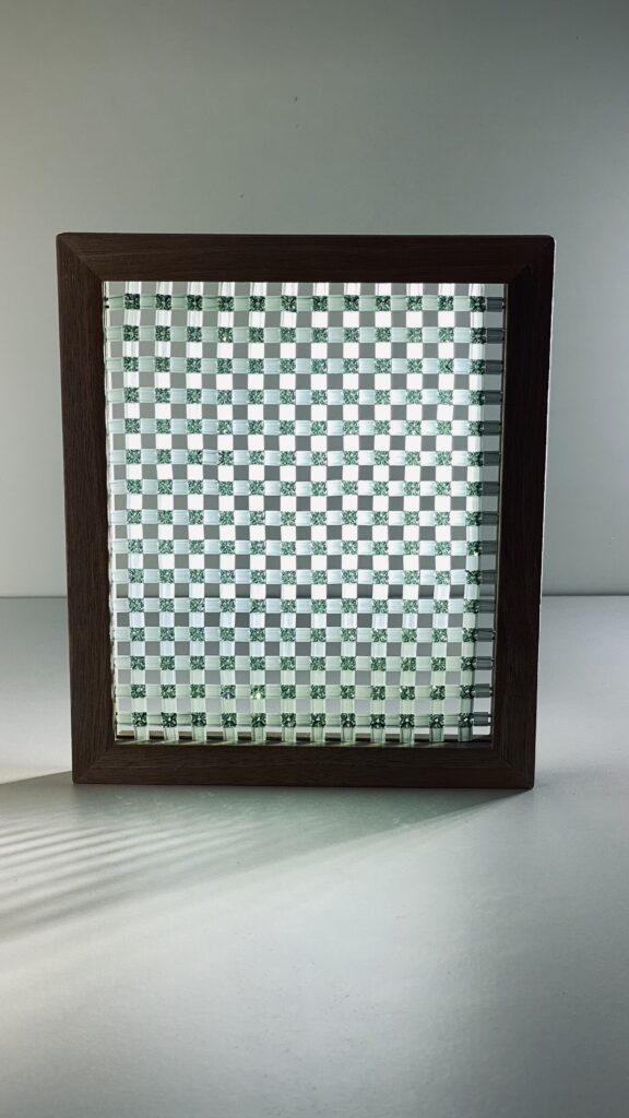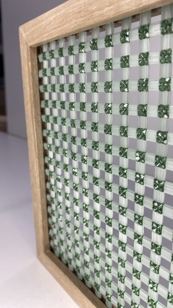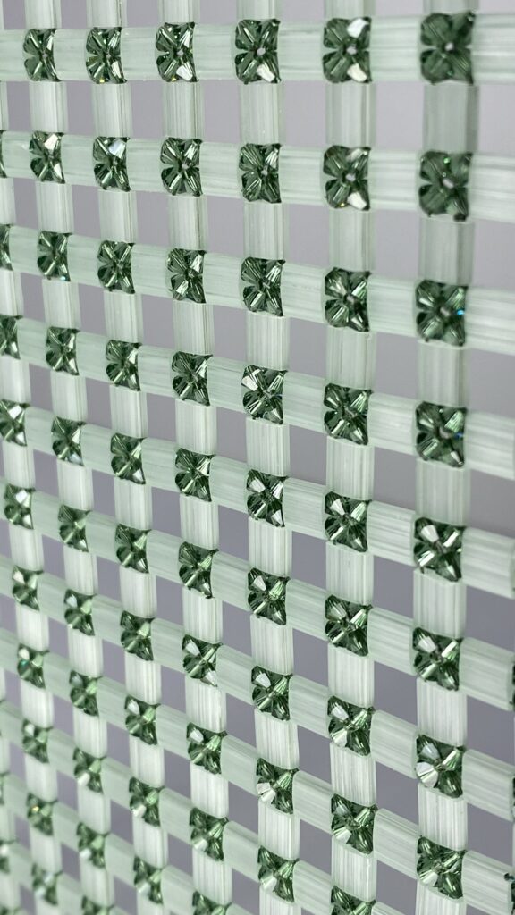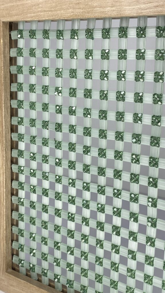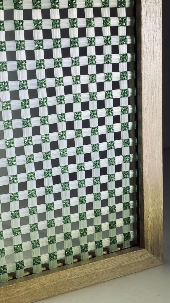 Le cadre AQUASIXTIES comme un panneau décoratif, propose un contraste entre le poudré satiné d’un carreau lisse et la brillance cristalline d’un montage étoilé.